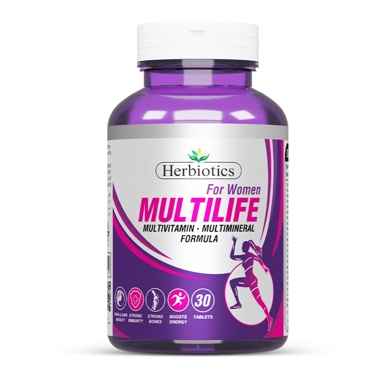 Herbiotics Multilife is a unique multivitamin and multimineral formula with over 22 important vitamins and minerals specifically designed for women’s health. Supports healthy skin, hair and nails, immune function, brain, joint and eye health. Helps reduce tiredness and boost energy. Contains Calcium, Magnesium, Vitamins A, B, C, D, E, K, Iron, Zinc, Ginkgo Biloba, Co-Enzyme Q10, Ginseng, Lutein, and Biotin.
