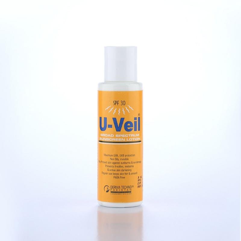 Derma Techno U-Veil SPF 30 Lotion is a water-based broad-spectrum sunscreen providing UVA+UVB+IR protection. PABA-free, non-greasy formula suitable for all skin types. Prevents photosensitivity, melasma, uneven pigmentation, freckles, wrinkles, and skin aging. Contains Benzophenone-3, Octyl Methoxycinnamate, and Titanium Dioxide.